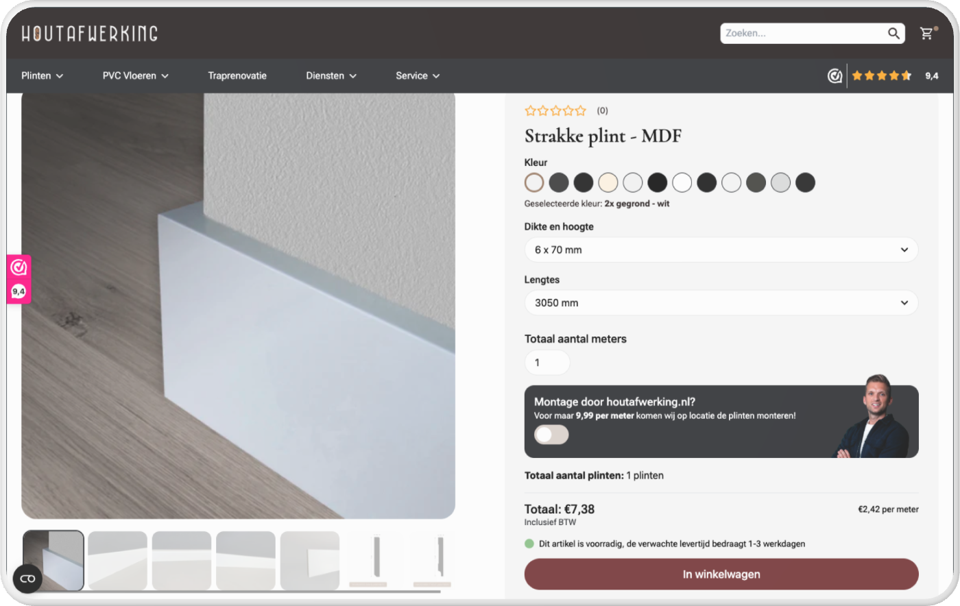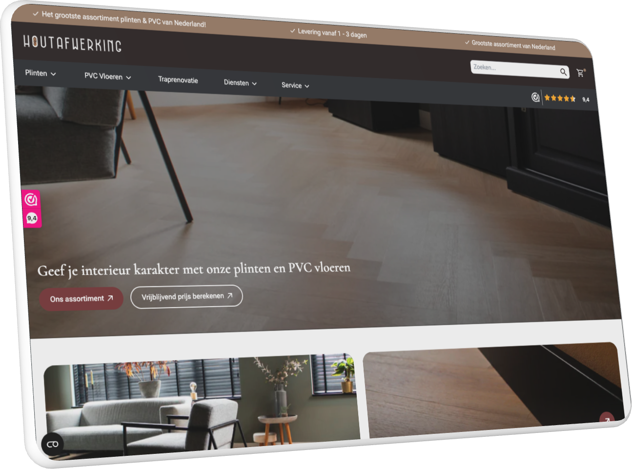 Als Shopify ontwikkelaar hebben we nauw samengewerkt met het team van Houtafwerking.nl om een gebruiksvriendelijke en converterende webshop te ontwikkelen. We zijn begonnen met het bespreken van de doelstellingen en vereisten en zo hebben we een aantrekkelijk ontwerp gecreëerd dat aansluit bij hun merkidentiteit.