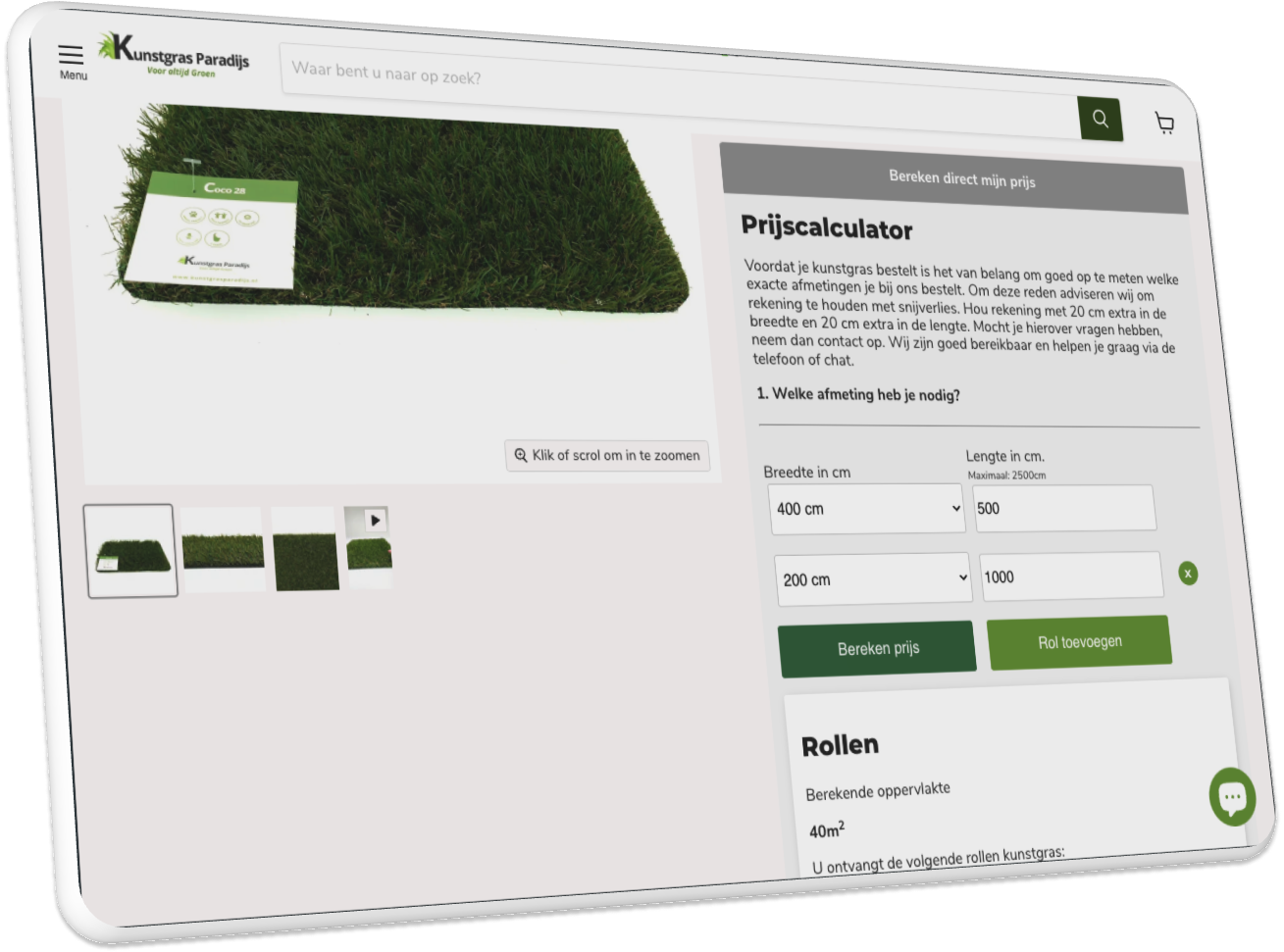 Kunstgras Paradijs, een bedrijf dat zich specialiseert in de verkoop van hoogwaardig kunstgras, kwam bij ons met het vraagstuk of wij een op maat gemaakt Shopify prijscalculator konden ontwikkelen.